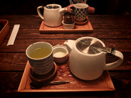A friend brought us here in the pouring rain. We were originally going to the other japanese restaurant for sushi, but decided to stay for their tea. We got the Yame Gyokuro and Kuromame cha. As my wife is a tea fanatic, I believe we can say that they were certainly high quality. The waiter said that the Kuromame was roasted in-house, and you can tell a lot of care was put into these teas as their flavours were superb and not very tannic. The yame gyokuro has a lovely umami taste and leaves a wonderful aftertaste in your mouth, and the kuromame cha, for a lack of a better term, tasted like a really light coffee without the bitterness. The waiter also recommended their mochi to go with it, and we got the yuzu mochi and matcha mochi. The matcha was perfectly sweet and done well. Sometimes restaurants burn their matcha but this was not the case. The yuzu mochi really stood out to me as a citrus lover. It had the brightness of an orange, and was not too overpowering, much like a gentle lemon zest. I highly recommend trying this. as it is one of my new favourites.