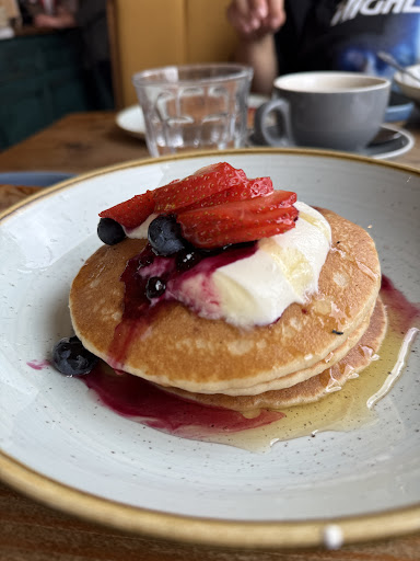 The atmosphere was as warm and welcoming as ever, and the staff were genuinely kind and attentive throughout. The pancake stack (pictured) was the star of the show – perfectly fluffy, topped with fresh strawberries, blueberries, tangy compote, Greek yogurt, and a golden honey drizzle. It looked almost too good to eat, and tasted even better!