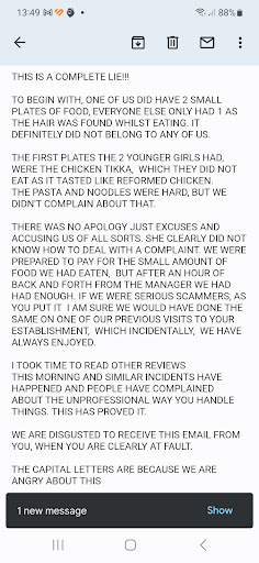 The owner decided by this point that he was going to stick to his guns and refused to budge despite us mentioning that we've dined here in peace so many times. He put himself above us as customers and told us that it was us in the wrong. We mentioned that again, as per our previous visits, the food quality was poor, dry and overcooked, and the prices would suggest a dining experience out of a London restaraunt with Gordon Ramsey himself treating us to a BBQ delight. He then told us again that we were wrong with our judgement of the food.