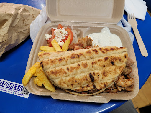 Unbelievably good food! 👌🏼 I would highly reccomend the fritters - go for the mixed one so a couple of courgette and a couple of spinach. If the chefs give you some of their special spicy feta dip as well then you're onto a winner. If it's not on the menu then it definitely needs to be! Such a friendly spot and if you're unsure what to get, ask for a reccomendation and you can't go wrong. Even better is if you're there on the right day pop into The Fell Bar, Penrith a couple of doors down where they're serving local craft alcohol and offer a £9 special where you can get a pint/glass of wine and pitta wrap/salad/mezze fritters/chips &... All you do is pay at the bar, take your receipt to Just Greek, order, take a buzzer, finish your pint, pop back, pick up your food and then eat it at the bar with another beer - go for the IPA. I had no idea upon going in the accolades this place has, but after one visit you can 100% see why. Authentic and fresh it's just absolutely cracking. You'd be a fool not to and it's hard to resist getting more on top of the meal deal - I tried a mixed gyros and halloumi salad as well just because you can tell on walking in that the food is going to be worth it and I was not disappointed. Amazing and I hope to be...
