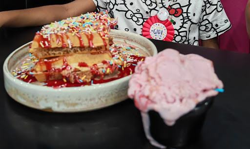 My youngest only wanted a waffle with syrup and sprinkles but apparently you MUST have the ice cream, so it was agreed this would be served on the side, when the dessert was bought out (with the ice cream in a tiny metal ramekin melting down the side) it emerged that they had put the ice cream on the waffle anyway then scooped it back off when they remembered her request, leaving remnants of ice cream on one of the waffles, which they tried to disguise by putting another waffle on top. Good thing shes not dairy intolerant!
