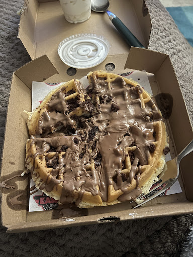 Additionally, the waffle itself was a letdown. Although the waffle base was freshly made, the white chocolate flakes and sauce were too thick and solid, making them difficult to stick to the strawberries or the waffle. They came off in chunks, which was not enjoyable. The strawberries, however, were fresh and added a nice touch.