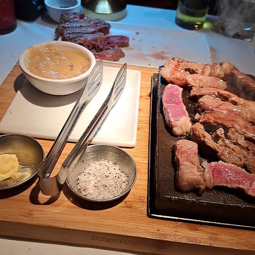 I’ll start by saying the food was really lovely. The all you can eat steak is a great idea and it is good quality meat - the sides and sauces were delicious too. Big downfall to this place is rude staff, and just generally poor service, we booked and brought 4 small children, we were quickly told upon entry if we were having all you can eat steak the children have to have it aswell, baring in mind one of them is 1 years old 😂 (I had to ask for a high chair 5 times) Before I go any further - at no point did I ask for all the kids to eat from our plates, I literally asked if we can order them a kids meal. Which they don’t do. Waitress was defensive when explaining they don’t give out free food, and I reminded her why would I be wanting to buy them all meals if I was going to then feed them my food aswell? Makes no sense. We finally came to the agreement we could order side dishes for the children - why don’t you have a kids menu!! This would eliminate any chances of people trying to feed their kids for free!! Second negative to this place is the waiting times, steak and hot plates arrived, waited another 10 mins for steak sauces. When we asked for any refills there was long waits, and god forbid you need a new hot plate - you’ll be waiting 30 mins! How can you enforce a time limit but then keep customers waiting so long. To conclude we felt as though this business is extremely money orientated, they’re so worried and focused about people trying to get an extra portion of chips out of them that they forget to provide decent customer service to people who are paying to be there. They were all either having a bad day or hate their jobs. It was miserable. In the end we left a £20 tip as a good deed. Hopefully this reminds them in the future to treat customers better and improve the way they do things. We weren’t asking for a lot but were made to feel uncomfortable. Mainly get yourselves a kids menu! Sadly we won’t be coming back or...