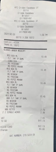 Dreadful experience and food order not honoured 😞, do not go there !!!!!! Rip off to say the least and do not honour the order Bought 4 tower box meals and drinks, cost £47.56, staff, no chicken bites in order, and didn’t get my drinks as they handed me a big bag and said there you go, I realised I didn’t have the drinks and phoned them up and spoke to the Assistant manager, he said sorry and said call back in and I refund the order for the 4 drinks and bites, drove back there and the so call Assistant manager said he couldn’t refund the drinks as they part of the meal, ( Breaking the law) I said don’t be silly you asked me to drive over to you and your refund the 4 drinks as I never took them as never given, he said you didn’t take them and we can’t refund as they were in the meal, I asked him if I left them and he agreed but said no refund which is ridiculous and they have ripped me off for around £9 which is actually theft in my eyes.