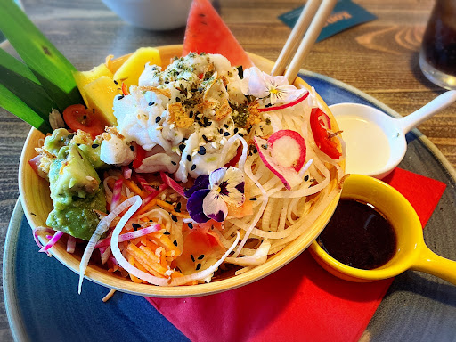 Adele showed us to a table, let us get settled and then gave us some menus. First off we ordered some mocktails. My daughter opted for the peach fruit cooler and I had the Nada-Lada. Both drinks were delicious. We then ordered our mains. We both chose a poke bowl with cauliflower karaage. The freshness of the food and the intense flavours was insane. By far the best meal of our holiday!