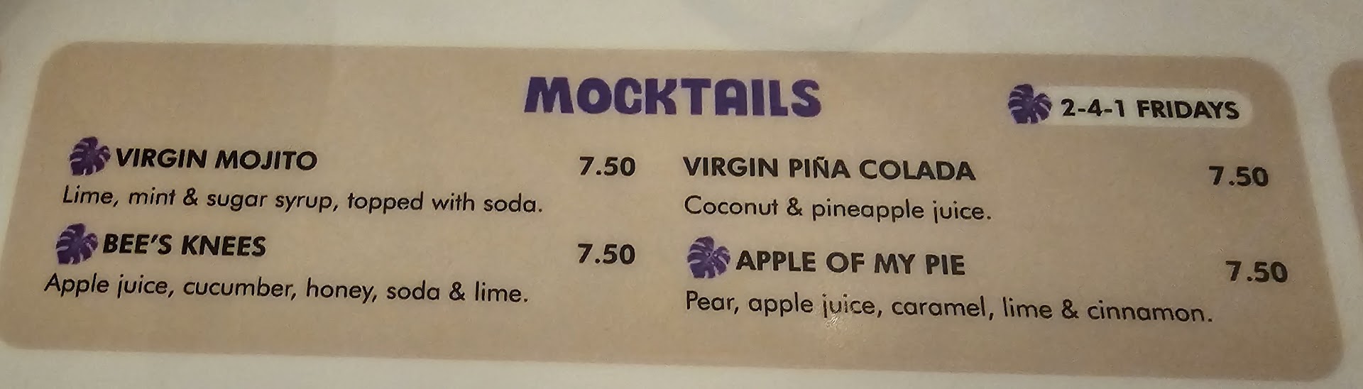 Additionally, the "mocktails" don't even have any 0% alcohol spirit alternatives, the "virgin pina colada" is literally paying ÂŁ7.50 for a glass of pineapple and coconut juice. With so much effort into a range of alcoholic cocktails this is deeply disappointing. Strongly recommend adding some actual mocktails to the menu that are more than just fruit juice.