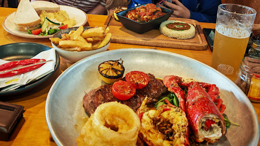 Now for the star the show my surf and turf...the steak 🥩 oh my days it was cooked to perfection...rare and absolutely lovely. Alongside the steak in the big metal tin bowl I had was some fantastic beer batter onions rings and followed by some cheeky chargrilled tomatoes. Also the star of the show a full lobster, which the kids complete stole the show. By this I mean I was clueless what to do with the lobster, however I guess I have YouTube to thank here as my kids decided with the tools provided to the with lobster. They had the whole task to hand, within minutes they was dissecting the lobster as if were a scene out of Casualty. Any way, they both ate the lobster between them and absolutely loved it. They ate the whole thing! It also came with old school chips which where out of this world. Chunky old fashioned and cooked in chip pan. Youngest had an Oreo cake which was also awesome. Would definitely go again. Price was reasonable for the quality of food.