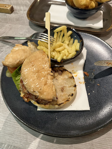 Great starter and nibbles but certainly not a good burger. Also atmosphere spoilt by a bloke having a business chat on his phone that the whole room could hear both ends. Firstly the Bun was supposed to be a brioche. This clearly isn’t. The beef patty was tough dry and under seasoned. The whole this was certainly not worth £16. We have a local country pub back home and their offering is twice what this was. For one you get onion rings and a salad with it. There was no offer to reduce our bill having only eaten a small amount of the burger. And they had the cheek to charge a set gratuity