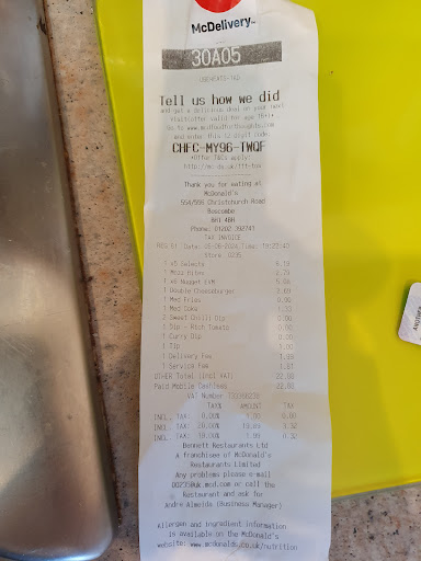 My partner and myself mainly order via delivery and I have to say (plz don't jinx me for writing this down) that the Boscombe Store is better than any other McDonald's closer to us for this. At all the other ones we've had food arrive in very strange ways from Big Macs smelling and tasting like cigarettes, you'd order two burgers and two fries and a burger would always be missing so one of us went without and don't get me started on opening a Big Mac Box to find all the buns on the bottom of the burger and the rest in top. Like, how? Enough about that, what I'm saying is that this doesn't happen there, with the help of the drivers (they deserve some of the credit) our food arrives warm, its not stale and you don't get any weird surprises or missing food. Its good food as fast as you can. Boscombe Store and your drivers, you could really teach the other McDonald's a thing or two, please don't ever...