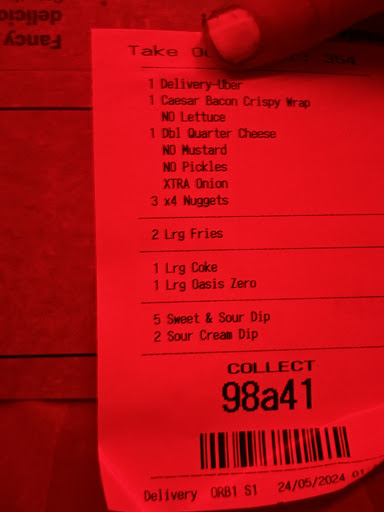 Ordered via Uber Eats for home delivery and assume order came from here as closest to delivery point. Order was for 4 people, including 1 happy meal with squishmallow toy for visiting grandson. No issues ordering via Uber and the overall delivery process. Order was delivered at the specified time. Secure in taped up bag. That's where the good points finished and where the negative ones begin. The food was luke warm at best. Realised on opening up the order and sitting down to eat, it was missing all 3 x sauces from meals and also the fruit shoot drink from the happy meal. Checked the Uber order and it wasn't my error. Also checked the ticket on the food bag and all the missing items were listed as required so entirely complacency by Mcdonalds. It was a weekday lunchtime order not a weekend, nor was it a complicated order. Really hard to get wrong. Other reviews indicate missing items are not uncommon. Very poor service as the order was pulled together. At over £30 for the order and paying a service charge for the incomplete order, it was a very disappointing experience. No option to remove service charge for receiving part order to compensate for missing items. Would not use Mcdonalds again for delivery as you cannot guarantee to get what you are paying for. If you are ordering and eating in restaurant you have control of what is in your order and return to counter of anything is missing. In future i will order similar elsewhere and put a pocket money toy in a bag to keep the grandson...