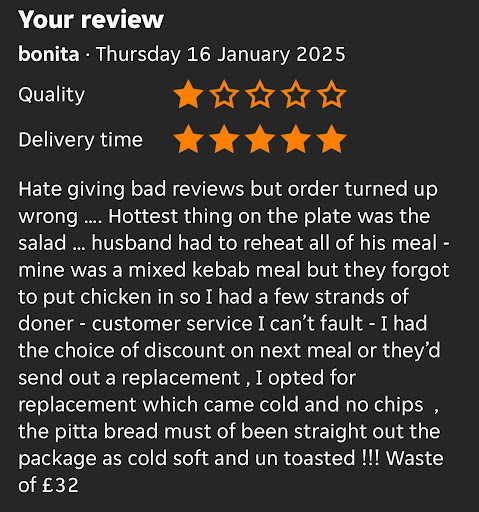 Read moreOrdered from website Ordered two burgers last night, arrived and they were wrong so we called and they replaced the food. Checked and the food was wrong again. Order the chilli con carne burgers but we’re given the Mexican burgers. Called to say the were wrong and they told us the burgers were correct. When we said the chilli was cold and looked like salsa they said chilli con carne comes cold, meatless and that we were wrong. Rather than apologising we were told we were wrong the burger comes like that and he’s send us pictures of what the burger looks like if we want. I’m not sure if they don’t want to admit they’re wrong or couldn’t be bothered to redeliver the correct food or if they just didn’t know what chilli con carne is but they should have at least offered a refund and they could have taken the burgers back if they wanted because they were cold when they arrived. Don’t know if it’s as to do with the old cold salsa in the burger but whatever. Oh and the chips were meant to have peri peri seasoning but didn’t. Terrible service, mediocre...
