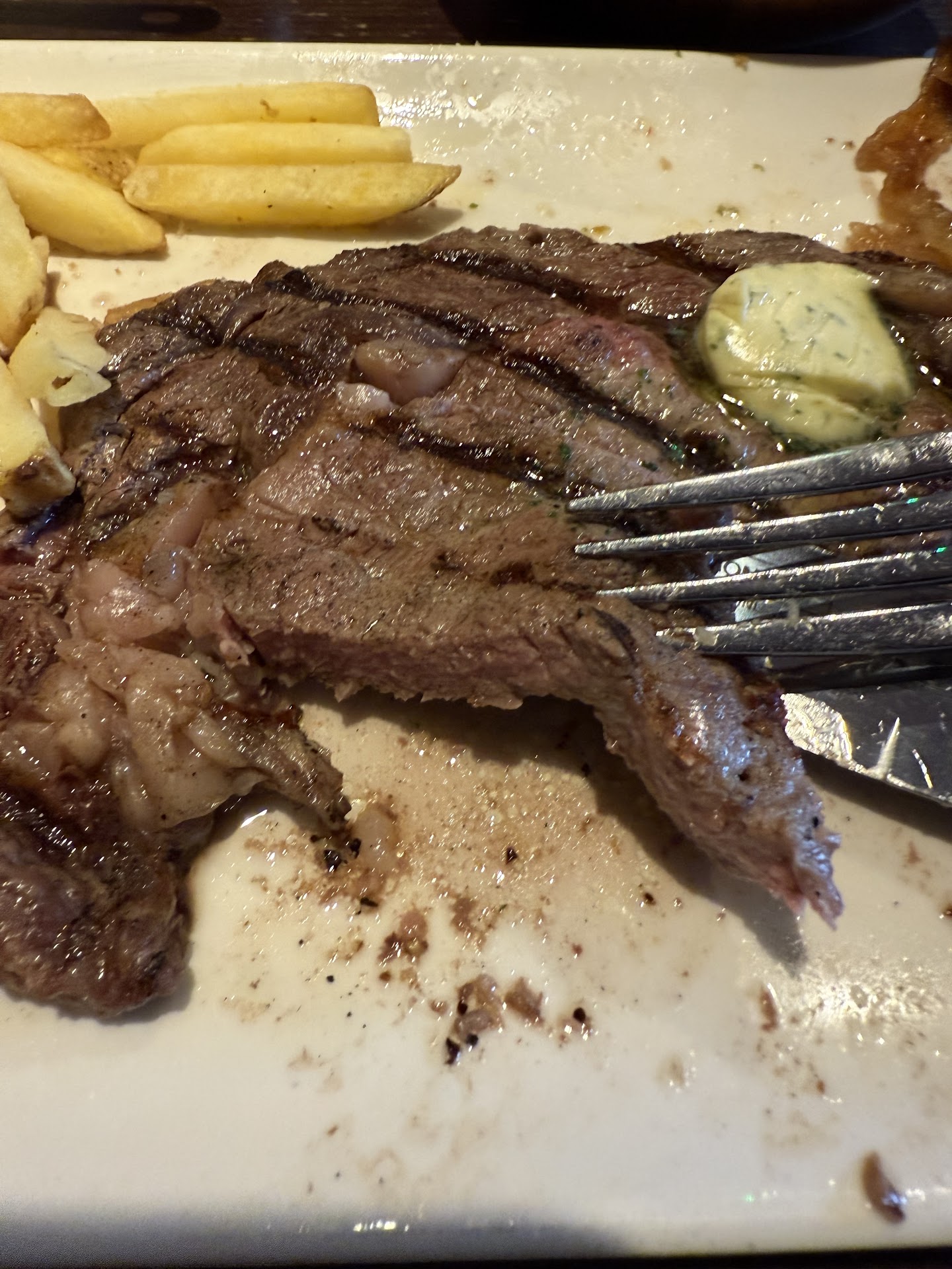 My ribeye steak was ordered medium-rare but was definitely the other side of medium (this includes according to their definition on their menu) - however it was tasty, we were hungry, and didn't want any further delays so I didn't send it back. The sirloin was ordered well-done and it was (and elderly mother definitely liked it!). The fries had evidently been standing around a bit before they were served to us...