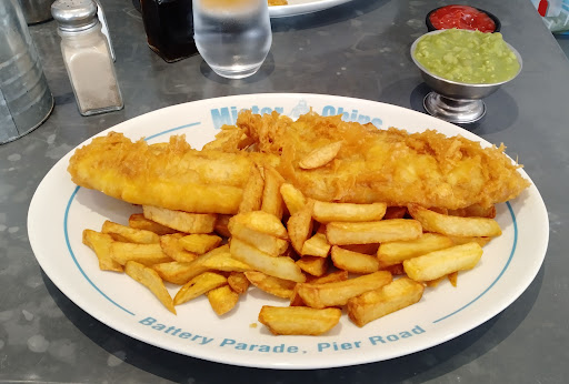 Read moreThis was our visit to Whitby, and had heard that Mister Chips was well worth a visit if going. They have 2 outlets, the main one is on the Abbey side of the bridge, but we chose this one by the harbour. We decided to eat in the restaurant, rather than get a takeaway due to the weather. The tables were well spaced, and everything looked very clean & tidy. The waitress was very polite and friendly, and in all we only waited about 5-10 minutes for our food to arrive at the table. We'd ordered the large cod & chips, battered sausage & chips, and drinks. Considering the prices were a bit on the high side compared to some of the other places, I was a bit surprised to see it didn't include mushy peas, so had to order those separately. The chips were very nice, not greasy, fluffy inside, but not the best I've had. However, the Cod was absolutely delicious, in lovely golden crispy batter, not at all greasy, and the fish was soft, melt in the mouth, and was large as ordered. The battered sausage was equally well cooked, and quite tasty. Overall, I think the food & service was excellent, so would definitely eat here again. It's a good location too with views of the harbour and abbey, albeit partly obstructed by some funfair rides, and I felt just a bit expensive to be making mushy...