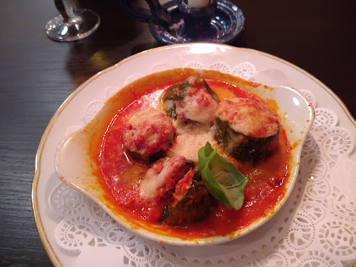 For starter I tried Zucchini Ripiene off their specials - this is courgette stuffed with beef mince, oven cooked and served with pomodoro sauce and mozzarella. Portion size was good, everything was seasoned nicely and tasted great; the photo may make it seem like there was a lot of sauce but it was about right. My main was also off their specials - at Italian restaurants this is usually a good way to try traditional dishes less common in this country. I chose the Spaghetti Al Granchio; this is spaghetti, crab and garlic with a bit of pomodoro sauce. The crab meat was a mixture of white and brown and properly shelled; it's not often I get the claws but actually easy enough to eat off. The dish contains chilli but more for heat and flavour so didn't overpowering any flavour. There was a lot on the plate so definitely filling and good value for money; highly recommend this dish if you like crab. For dessert I fancied something fruity (it helps cleanse a mouth after chilli) so the waitress recommended Frittelle de Mele; deep-fried apple doughnuts on crema pasticcera (the Italian version of crème pâtissière). Fruity and refreshing this dish is a really nice way to finish the meal.