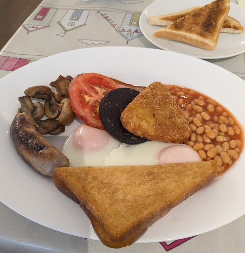 Muffins - Full Breakfast (as opposed to the smaller āstandard breakfast) - 1 Rasher of Bacon, 1 Sausage, Hash Brown, Mushrooms, Beans, 2 Eggs, Black Pudding, Grilled Tomato, 1 Fried Bread, 1 Toast - Ā£9.50.