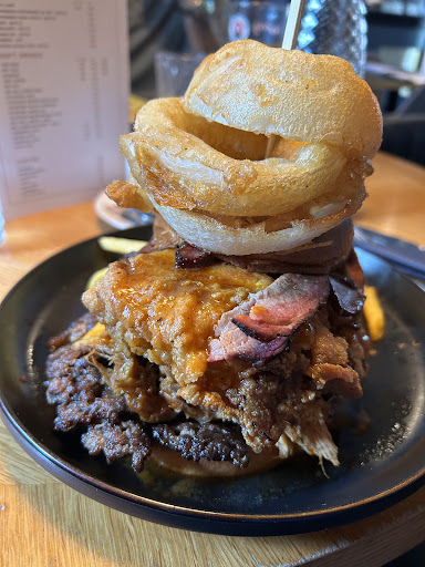 The burger was truly a wonderful thing. Two smashed patties, plus the chicken thigh, the pork and brisket, and onion rings and fries. And a lovely buffalo sauce. A taste sensation and a belly buster. The onion rings were good, lovely and crispy. And the fries were canny dam good too.