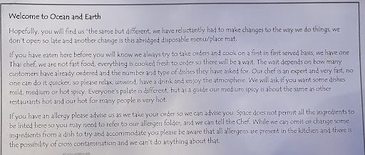 This is a fantastic, if somewhat quirky, Thai restaurant. We arrived to Looe with nowhere booked for dinner and many places seemingly full unless we could wait until 8pm or later. Phoned the Ocean & Earth Thai Restaurant and was told a table was just about to leave so the owner would hold it for us until we got there. From the street, we were having second thoughts, and when you go in its a very small space with alot of tables crammed in very close to each other. The owner is an interesting character and, whilst English, had clearly travelled extensively in Thailand based on the photos all over the walls. I could see how other reviewers might not have taken to him or had brusque responses from him but that was quite charming in a way. His wife does all of the cooking on her own and is an amazing chef - the food was really quite excellent. Despite how busy the restaurant was and the warning on the menu that food may take a while, it was actually quite quick. I can see why others would say its the best Thai they have ever had, it really was good, but I dont feel that I eat Thai food often enough to make that bold a statement. I would have no hesitation in recommending to anyone though. You can order many dishes in mild, medium or hot but just be aware that the menu and the owner constantly tell people their medium is like other restaurants hot. I can believe that because we went for mild after being told that and it was still quite spicy! I dont understand why they dont adjust their descriptions to match what people expect rather than having to tell every single customer that the ratings are not what they would normally be everywhere else. Not a criticism, just something that would seemingly make life easier for them... Superb, if I am back this way I may...