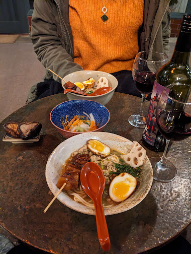 Passed this place whilst in town with my son for his birthday lunch. Must say the arcade has been transformed into a hub of independent food and drink places. We went upstairs as directed. Found a nice table and had a look at the menu of Japanese greatest hits. We ordered via Jo the owners mum. I think he was called David and was at a external event. We decided to try the shoyu ramen, karrage, beef poke and gyoza. Whilst not protocol I had wanted a coffee and Jo allowed me to purchase one from the other independent coffee shop further along. My son had a ice cold asahi beer. The food duly arrived and the ramen with the sliced pork was visually stunning almost like porchetta. Karrage was crisp but moist thing meat. Gyoza presented as they would be with dipping sauce. Taking some pictures before sampling. What I wasn't prepared for was the soy based broth, I don't like dashi so been able to have this sort of ramen was great. Presented with a egg the pork slices hid the ramen. Beautifully long noodles with a bit of bite. Slurping as you know is a must. The pork beautifully melted in your mouth. In between we shared the karrage well 70_30 to the lad. He was impressed with his poke bowl loving the edanmme beans. Visually a hue of reds and greens laden with goodness though he wished he could have had a fried egg on top. The dumplings I didn't get a look in the plate of 6 he said the skins were perfectly done not soggy or overdone. The pricing was excellent for the quality and deserves to be championed if this is the quality. Perhaps future options of dorayaki or moochi as a desert. Sushi of course is available but we were too full. And we wouldn't do it justice. Return...