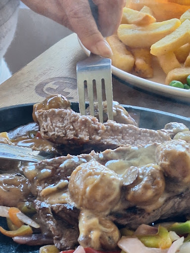 Great reception from the member of staff at the computer. Shown to our table promptly. Drinks and meals ordered at the bar. Drinks served in plastic cups on match days even though I hadn't been to a match!!!! Only waited 15mins for 3 meals to arrive. I can see why!!! Waitress put food down and set off to leave, we asked for cutlery and she flippantly called over her shoulder "cutlery station". We called her back to ask where that was and she waved her arm in a vague direction!!!