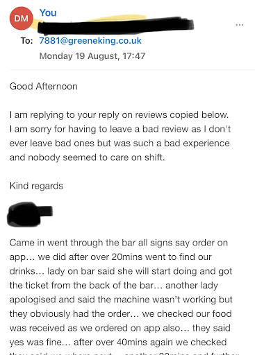 A generic reply to the original review to get in contact and discuss which I sent an email apologising for for the bad review but it was terrible service and was happy to discuss further but after the email was sent was fully ignored again same service as in the actual pub shocking 😮 so no we will not give them...