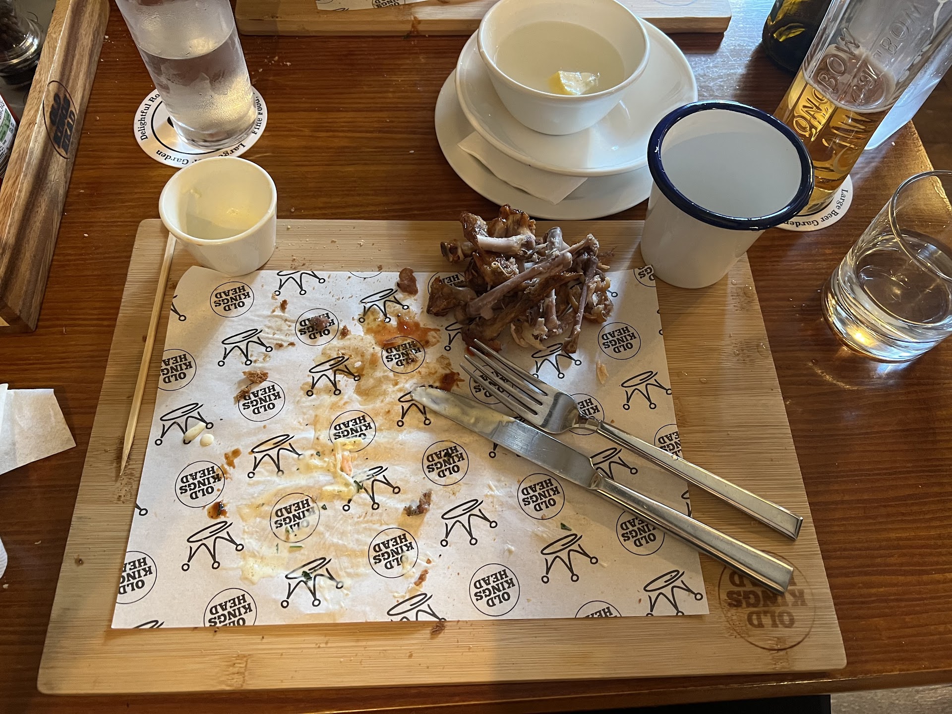 We go into the Old Kings Head on a regular basis for food and drink when we are staying in Broughton which is quite regular. We have eaten there several times in the past with not really any issues, however last night 11th June 2021 was a complete different story. We ordered Tomato and Basil soup home made (NOT) More like Heinz with some fresh basil added and stirred in plus a Ham terrine which if I had thrown at the window it would have put it through and they're double glazed. The inside once got into was dry and overcooked. Very, very dreadful however it got even worse. The Prawn Linguini was over cooked Prawns dried beyond belief and the pasta was some undercooked and some overcooked a very special trick if you can do it. The Cumberland sausage and creamed potatoes in a rich onion gravy was a dried out and overcooked defrosted old piece of sausage with warm potatoes and a gravy that would make OXO look good. On complaining as we had both eaten very very little was returned with the waitress coming back from the chef saying (this is the best part) Everything is fresh was the chefs reply and your next drinks will be free. WHAT. I would have expected I'm awfully sorry obviously something was wrong can I cook you something else instead. No nothing like that. So I am truly disappointed A with the food but more swith the chefs non professional response. PLEASE DO NOT EAT THERE UNLESS YOU ARE DESPERATE. Darren the landlord seriously needs to address the...