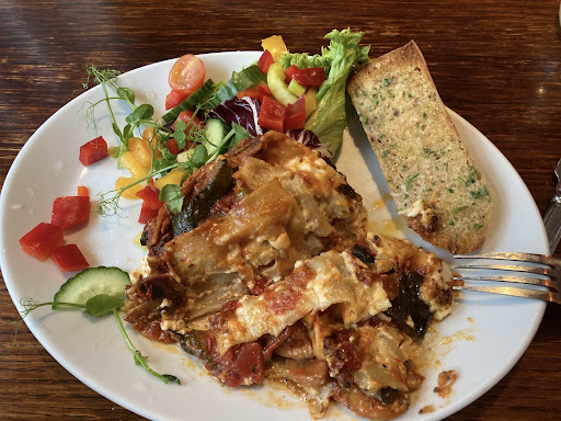 After a long wait the starters arrived, no issues here. However after another long wait between courses the mains arrived, a chicken breast meal and a lasagne. It quickly became apparent that the lasagne however was not vegetarian. The lady serving couldn't be more apologetic and took the dish away to be replaced. After a short time the server returned from the kitchen and informed us that their was no vegetarian lasagne available today. I am a quick eater so at this point was half way through the chicken and now my wife was having to choose a completely different dish because the kitchen hadn't informed the server when the order was entered but instead tried to pass off a meat equivalent!