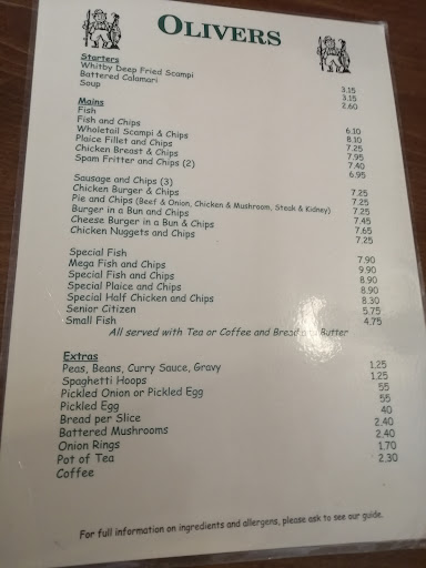 Lovely homely venue. Walked in and hadn't booked and seated immediately. Staff very friendly and courteous. Minutes later all the tables had been taken up. Ordered fish and chips with portion of gravy, peas along with a starter of salt and pepper squid. Squid was ok nothing special, 5 pieces per portion price was very reasonable Was expecting like a Chinese S&P squid but just deep fried pieces. Was our fault as this isnt a chinese takeaway so expectations of squid having onions peppers salt and pepper not Olivers fault Wasn't described as such so can't complain but wouldn't reorder as bland when tried Fish and chips were a decent portion but found batter on fish wasn't to our taste and had to peel it off both our plates Batter wasn't the normal light yellow puffy crispy batter as usually expected from fish and chippies but not tonight as tasted over done and batter wasn't light quiet the opposite and flat Meal came with tea and bread and butter choice of bread which was a plus. Overall don't think we'll be back but service and staff were an asset so may give a second call in when passing through Harrogate as may have been unlucky tonight The cafe was busy and shop also so may have been the reason for our meals being as served as was Again the...