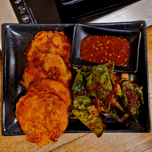 We started with the Kimchi Jeon (kimchi pancakes), which were excellent. They had a lovely, warm kick of spice and beautifully crispy edges.