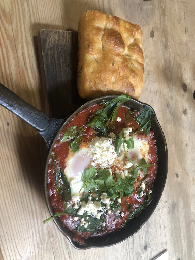 The Shakshuka - It comes straight out of a cast iron pan and served with a generous slice of cheese and leek focaccia.