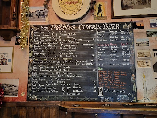 Pebbles Bar, in Watchet, Pebbles: A Watchet Wonderland It's tiny, it's packed, it's a glorious din, A cider tsunami, where do you begin? From orchards nearby, the amber flow, Real ales with names that make your face glow. Like "Old Rosie," "Thatcher's Gold," "Nasty Nick" so crude, "Wobbly Bob," "Riggwelter," no need to be rude. Best bar in the South West, year after year they've won, A boozy nirvana, second to none! The dogs, oh the dogs, a furry parade, Spaniels and terriers, not in the least afraid. They sprawl on the flagstones, they snooze by your feet, Man's best friend welcome, a truly dog-friendly treat. And next door, the chippy, a glorious sight, Fish and chips steaming, a culinary delight. You grab your cod supper, wrapped up in the news, Then back to the bar, no time to refuse. The vinegar sharp, the salt on your tongue, With a pint of "Pig Swill," a song to be sung! So if you're in Watchet, and thirsty as hell, Pebbles is waiting, cast off your spell. A raucous good time, guaranteed, that's the score, And you'll stumble out happy, then come...