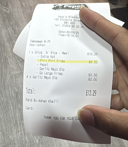 Read morePlaced an order with pepes, Blackburn for our iftar. It was a very large order, purposely made no other food at home. Firstly the order came late and secondly almost every time was missing. We received 5 items out of 10. Chips and drinks with meals were all missing. We received only one can of Pepsi. No chips with anything. 5 whole meals missing, side orders missing, barely any of it arrived. I called and complained and was absolutely gob smacked at how rude the workers were. They told us nothing could be done and all we should do is request a refund. We had near to no food to open our fast purely because we were relying on our takeout. I argued that someone should come and deliver the food that was missing as I have diabetic parents who needed to eat. They spoke in the back saying “she’s going mad” but made no effort to try and solve our issue. They even terminated the call while I was speaking! Absolutely disgusted!! If I could give a minus 1...