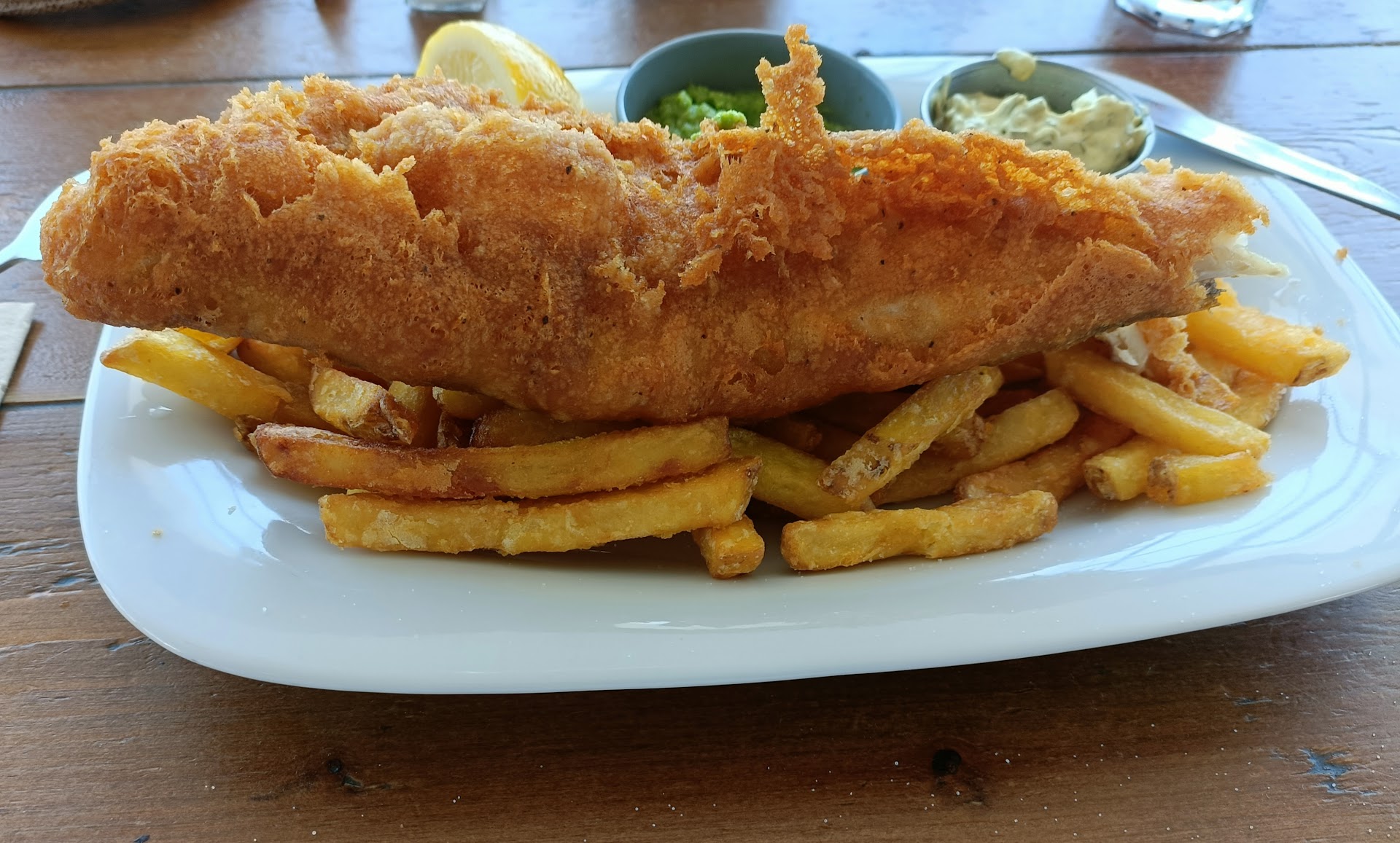 Coming from proper northern stock, I arrived with the sacred expectation of fish, chips, and mushy peas â the holy trinity of seaside sustenance. The fish and chips were genuinely excellent: crispy, golden, and satisfying in that way that makes you forgive Britain for most of its culinary crimes. Skin left on the fish, which purists might debate but I found perfectly acceptable.