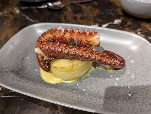 We ordered six dishes: cheese and spinach croquettes; baby squid; Padron peppers; Pluma pork (the signature dish); braised chorizo; and octopus leg with dauphinoise potatoes. All of the dishes came out quickly, and all were absolutely delicious. The pork was tender and covered in some marvelous marinade, the peppers had a lovely charred flavour, the chorizo was rich, the croquettes melt in your mouth, the squid was done with a tasty aioli sauce, and the octopus was really tender with a lovely flavour.