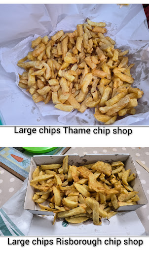 If you drive to the chip shop in Thame, then you get far more chips - at least twice as many and they are better and nicer (and cheaper) . I actually took a photo of the the chips at both places to compare and contrast because this has become annoying.