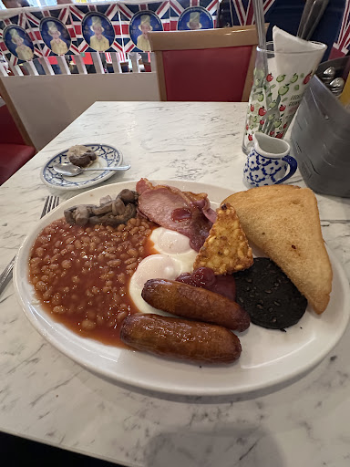 Read moreFirst time using this cafe, (Thai staff.... offering Thai cuizine but not sure of times), cleverly associating itself with the strong positive image of our late Queen. Lots of photos, quirky life-size model and red, white and blue. Well frequented by locals for their coffee, tea, snacks and chat, greeted warmly by front of house lady who is very welcoming. Cooks are quiet, efficient, busy and evidently take hygiene very seriously, wearing gloves and hair nets. Cafe is airy, clean and pleasant with outdoor seating and parasols. I had leisurely morning tea, served in china tea pot providing 3 good servings, tasty breakfast omelette and two slices of buttered toast, on traditional matching service. £8.75 Altogether a pleasant,...