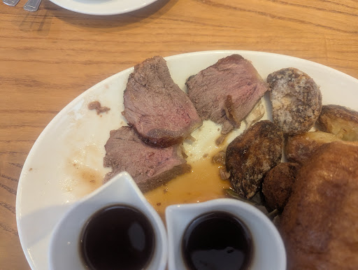 Read moreAbsolutely terrible Sunday roast. Booked for 4.45pm. service a little slow to start but a lovely waitress, Maddie. Roast dinner was by far the worst roast dinner I've ever eaten. Sent it back once as it was very clearly the end of the beef and just cuts of fatty corners. This was then changed to three little bits. The manager man came over and asked how it was, and I questioned whether this was a usual size portion of meat as it was so tiny, he said yes, I am afraid we have to stick to 100g (this absolutely wasn't and I'd say 60g at a push - this is the picture). I asked would he be happy if he was served this, to which he pulled a face, and I said well you clearly wouldn't. He said I'd probably ask for more meat. So I said 'may I have more meat then please' to which he said sure and went to get some. The dinner itself not great, cold veg, cardboard stuffing ball and overly floured roasties (still white with flour). A really terrible Sunday dinner. Never eaten here before and only tried as I live locally and receive vouchers through the door. Thank god it was 40% off as I'd never had paid nearly £16 for that meal. Not one to moan at all, but this was just so rubbish I wouldnt want anyone else to eat it! 🤣