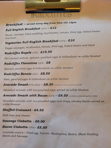Read moreCalled in with our grown-up grandson on a breezy spring weekday morning for brunch. Cheery welcome to a pleasant eating area inside. The seats filled up over the following 20 minutes with a steady stream of elderly locals (several with their dogs) calling in for a pot of tea or a coffee. So the place developed a quiet sociable hum of chatter. All in all, a pleasant relaxed ambience, but our grown-up grandson must have been the only adult not collecting a pension. Pleasant coffee, although there is no filter coffee option. We sampled 3 of the 'Radcliffe' offerings; Blennie, Royale, and Florentine (with black pudding on the side). Good sized portions and tastey components served quickly and without fuss. So, why not the full 5*, you ask? The purists amongst us replies.. poached eggs, just slightly overcooked, (yokes hard) bloomer slice, I'd have preferred a nice artisan granary. We'll be calling in again as our visit to @AllianceFishMongers was a major success, maybe Radcliffe's could be persuaded to use Alliances hot smoked salmon steaks..now that would raise any breakfast option to 5 (gold) * and I'll be specific about my eggs, and request a granary chunk rather than the bloomer. Oh yes, it goes without saying that whilst not cheap, prices were...