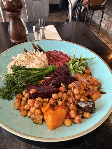I had the ROAST VEG AND HALLOUMI WRAP £9.95 With lettuce and spiced hummus, served with fries. (this like quite a few other dishes on the lunch menu had a vegan option available). It was well presented, very tasty and a satisfying portion. My wife and daughter were equally pleased with their dishes, BEETROOT BURGER (Vegan) £9.95 Served in a Sourdough Bun, Topped with BBQ pulled jackfruit, pickled red cabbage, crispy onions and vegan mayonnaise and for my daughter, SMOKED SALMON LINGUINIE £8.95 Creamy smoked salmon, served with a garlic croute.