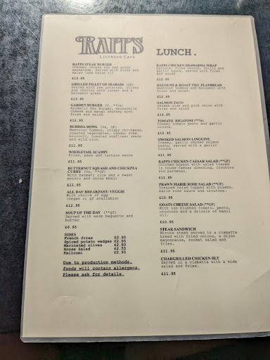 Read moreWe have been frequenting Rapps for many years and the food and service have been faultless. The new dining outside experience especially in the fantastic weather over the weekend is bringing people out. HOWEVER. This Saturday was NOT a good experience. Waited a long time to get served and when we eventually got the menu all the usual sandwiches were missing and it was a drastically reduced choice. But things change so we opted for a full breakfast that my wife and I would share. I like my tea and coffee with the meal but this could not be accommodated as we were told - wait for it. It was done by a different "Department". Wow, they now have department at Rapps. So sure enough he coffee and tea arrived but the food came some 20minutes later. They did accommodate us by sharing out my breakfast but also charged me an extra £3.00. (Normal large breakfast is £8.95. Cost on the bill - £12.00. All new young staff who are just not interested. Come on Rapps. We are back trading again. Where did your standards disappear to. We wont be coming back and we...