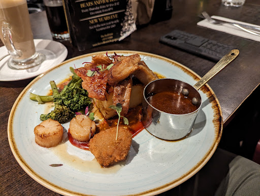 Would give 0 stars if I could. Been here previously but standards have massively dropped. Came here yesterday with my partner to have a relaxed dinner and it was really poor. I do understand that it was the end of the day but the carpet where we were seated was dirty with bits of food around and waiters were acting really unprofessional and were seen swearing at each other throughout (having banter is okay but not swearing and not when there are still a few tables eating in the restaurant) showing middle fingers to each other, female waiter shouting “bruv”, “I swear to god” and they all just seemed not to care. —This wouldn’t have bothered me as much if the service had been better either. Our food came out way before our drinks and they tried to serve a different dish to the one we ordered. I hate to leave bad reviews but the atmosphere they built was not welcoming or nice especially towards the end. The person who brought our food from the kitchen asked us twice if anything else was forgotten and we said about our drinks & nothing came, we asked our waiter who took our order for our drinks twice while we were eating as he had forgotten what drinks we had ordered, he didn’t bother to look at the ticket or order to check and then when servicing the drinks he was eating crisps and snacks behind the bar whilst making the drinks with his hands and still forgot our water. He was generally just substandard when taking our order and did not seem care about whether he got our orders right and did not check for over 20 minutes whether we had received our drinks or not! Then he could be heard bantering with the bar staff about how it was their fault they didn’t make them yet, overall it was like he had not had any training, leaning on the bar and having banter instead of tending to the drinks in the first place. Our mains were the same but we got two different plates with missing parts like crackling & bread sauce on one plate but not the other, getting one Yorkshire pudding on one and two on the other, the Yorkshire puddings are more like pancakes too, very doughy and flat (only complaint about the food because the rest was lovely but this was not an enjoyable experience with the lack of good service and water to go with it). If you are okay with very bad service but good food only, then I would recommend here. Additionally, they make you pay 20% VAT which I would not mind normally but this is poor of them to do as a standard considering how shocking the experience is & how much they’re charging. I won’t be eating here again and would not leave a review unless this it was needed. I’d be embarrassed to provide that level of service to anyone, to say you work in hospitality but clearly don’t care about your customers is bad form. The staff overall need...