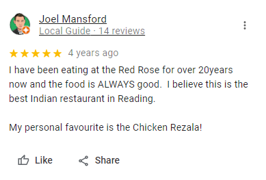 I don't normally review the restaurant unless I really enjoy it. For Indian, Red Rose is the best in Reading and probably in Berkshire too since I have tried pretty much every place in the whole Berkshire. Either eat in or take away, always deliver the quality food. Some restaurants are not good with take away but this one makes no difference.