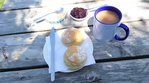 The scones were quite tiny. No flavour or noticeable home fruit in the jam. And also very average for an aga home baked offering. And that's ALL the food they offer at the moment. I even understand the paper plates fake cutlery and takeaway cups during covid. What I dont understand is the unfriendly indifferent shocking terrible customer service. No greeting. No smiles. Family stress on show, snapping at whom I presume is the little grandson telling him off... all he wanted to do was chat. Such a shame. If they dont want customers or cant handle running a tearoom, especially on such a below average limited menu, then why open at all?