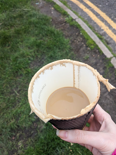 Food and coffee is nice, the staff are lovely. I've mentioned to the staff before that their takeaway cups are bad. They break apart quickly, you end up drinking cardboard before you can finish your drink if you don't drink quickly enough. I don't always have a takeaway cup on me. I got a coffee from them recently and the cup not only broke apart but a hole just split from the cup and I ended up loosing half the coffee before I was able to finish it and my clothes got coffee all over it and down my arms as I tried finishing the drink while it was leaking coffee everywhere. I tried slowing the flow (which became worse) as I drank it, I lost half the drink before I finished it. We shouldn't have to worry about getting a takeaway and losing half the drink and...