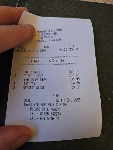 Read moreIt was almost a complete DISASTER!!!!! I had booked a table for my wife and I on a saturday night at the salamander for our anniversary and travelled pretty far to get there. However we both arrived 25 mins early and spoke to one of the managers and asked if it was ok to sit at an available seating or table and maybe have a drink while we wait or if that was not convenient we will return on the booked time. I could see there was a free table for 2 availble a metre in front of us, when i asked if we could maybe sit there, she then said in a very stuffy, abrupt and frosty manner "well you can sit there for now but you will both be moved and relocated" no smile, no hello, no how are you both or I'm really sorry but if you would like to return back in a bit we will make it really nice for you but just got that. It was like a sketch from little Britain when the lady says computer says no. Its such ashame as a friend recommended it and the reviews are really positive so maybe i got there on an off day. Luckily for us another resturant was available and the people and staff where really nice and very understanding and couldn't do more. My conclusion to this is by all means book a table at the salamander but be very wary about...