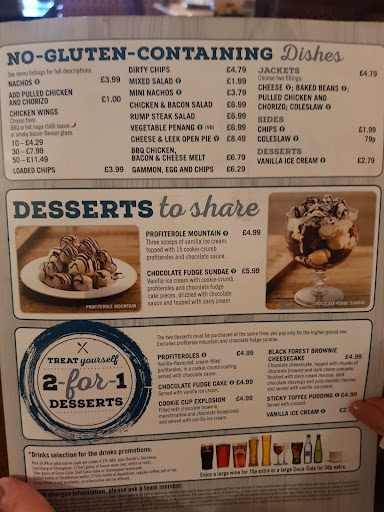 Well there are lots of pubs around and decided to pop in for our dinner as 6pmish. Glad we did. It was quiet at first but people were slowly turning up. There was some low level music playing & a game machine in the corner playing a loop. The menu is not massive like other pub chains but thoughtfully laid out with some interesting and different meals. Bottles of wine start at under 10 quid and every day features a meal and drink deal for just under 6 quid. Live music, quiz nights and other themes. The food was fabulous well cooked chicken burgers with pulled chicken and bacon with spicy sauce. Crisp and hot chips. It's was served quickly and by very pleasant staff. Locally this pub served the best meal around and has a varied menu worth trying. There is a gluten free section too.