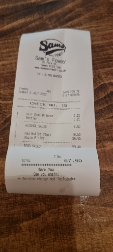 Read moreWith such glowing reviews I had the highest expectations. Even a close friend recommended Sam’s from a prior visit. Sadly, my experience was less than ideal. The food I would say is average. I’d eaten in a few places in Fowey over the last week and found Sam’s to be on par with others in the area. My partner’s seafood feast for one was nothing to exclaim about, and my burger was passable along with a side of chips that seemed to have the texture of those that were cooked and then reheated. The coleslaw on the side was nothing but red cabbage slathered in mayonnaise. The goats cheese bruschetta was cremated to the point of the bread turning to dust as it was sampled. The nachos were plain and miserable. I had an apple mojito which I am almost certain was simply apple juice with a few mint leaves added. I certainly could taste no rum, nor experienced the effects of any alcohol (and I’m not much of a drinker). The toilets were like something out of a horror movie, with urine on the seat and all over the floor. I had to clean the room myself before being able to use it. The hand dryer was also pitiful ensuring I left with wet hands back to my table. The ambience was good, and the wait team attentive but that is the limit of my positivity for...