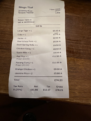 Read moreAbsolutely amazing! Decided to try Nings as it's the closest Thai restaurant to my house and so glad we did. We ate in the restaurant which is clean and fresh. The menu has a great selection. The portions are very generous and all our food was delicious. We have tried many Thai restaurants in the bay and this is definitely at the top of our list. The tempura veg was so crispy and light, the curry and soup were fresh and tasty. The service was great, very attentive and friendly. Such a lovely family run restaurant. We will definitely be back. Thank you for a...