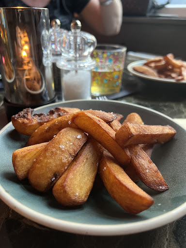 My honest review is, place looks lovely, staff are nice and friendly but food is not up there, it is average and for that reason overpriced. My friends rated their experience 6/10. Menu is a bit disappointing too, some of us wanted chicken skewers but while we were waiting for drinks, and food order we changed our mind. Portions looked uneven, burned. Hence we gone for steaks and pizza. £5 triple cooked chips were very disappointing to. Also two tables one by open kitchen and one by ladies toilets look no fun!