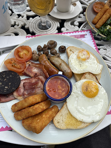 Read moreIt was not a warm day. So you needed a hot drink and warming food. A hot chocolate and full breakfast was needed. My daughter ordered the drinks through the app. The consumption of a hot chocolate with a whipped topping, marshmallows and a dusting of chocolate powder gave us time to examine the menu closely. The lounge breakfast looked good, but the black pudding, extra sausage, extra fried egg and toast on the full breakfast was too tempting. It was not a cheap option at a little under £13.00 for a breakfast, but it came up hot and well cooked. The eggs yolks were runny, the hash browns had the external crispness and a soft centre. The bacon was not cooked to a crisp, the baked beans were served in a little pot, thus keeping the hash browns crisp. There was little button mushrooms. Neither of us enjoy tomatoes, so we ordered without those.