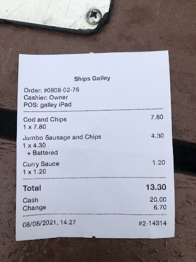 £7.80 for Fish & Chips and a decent size portion it was. £4.30 for Battered Sausage & Chips and £1.50 for Curry Sauce, all fair prices. The curry sauce did look a bit thick and lumpy but it tasted a lot better than it looked and it was quite a large tub.